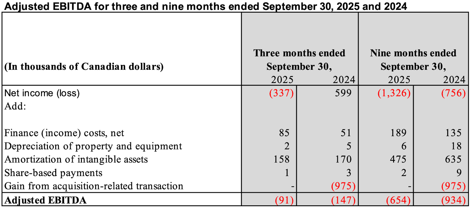 The table below reconciles net loss from operations and Adjusted EBITDA for the periods presented: