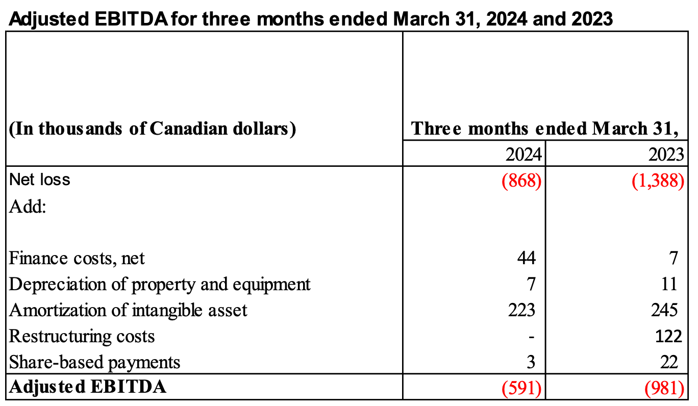 EQ Works measures the success of the Company’s strategies and performance based on Adjusted EBITDA, which is outlined and reconciled with net loss in the section entitled “Reconciliation of net loss for the period to Adjusted EBITDA” in the MD&A. The Company defines Adjusted EBITDA as net loss from operations before: (a) depreciation of property and equipment and amortization of intangible assets, (b) share-based payments, (c) finance income and costs, net, and (d) restructuring costs. Management uses Adjusted EBITDA as a measure of the Company's operating performance because it provides information on the Company's ability to provide operating cash flows for working capital requirements, capital expenditures, and potential acquisitions. The Company also believes that analysts and investors use Adjusted EBITDA as a supplemental measure to evaluate the overall operating performance of companies in its industry.