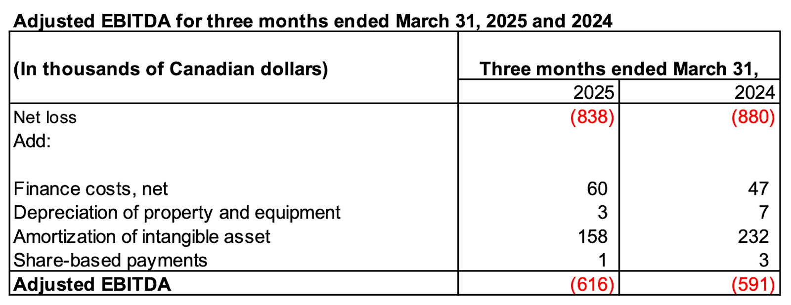 The table below reconciles net loss from operations and Adjusted EBITDA for the periods presented: