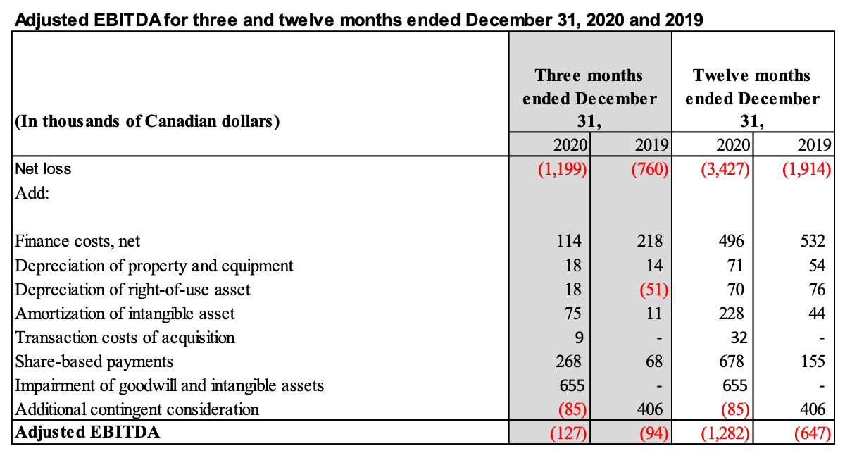 EQ Works measures the success of the Company’s strategies and performance based on Adjusted EBITDA, which is outlined and reconciled with net income (loss) in the section entitled “Reconciliation of Net Loss for the period to Adjusted EBITDA” in the MD&A. The Company defines Adjusted EBITDA as net income (loss) from operations before: (a) depreciation of property and equipment and amortization of intangible assets, (b) share-based payments, (c) finance income and costs, net, and (d) depreciation of right-of-use assets (e) additional contingent consideration (f) transaction costs of acquisition (g) impairment of goodwill and intangible assets. Management uses Adjusted EBITDA as a measure of the Company's operating performance because it provides information on the Company's ability to provide operating cash flows for working capital requirements, capital expenditures, and potential acquisitions. The Company also believes that analysts and investors use Adjusted EBITDA as a supplemental measure to evaluate the overall operating performance of companies in its industry.